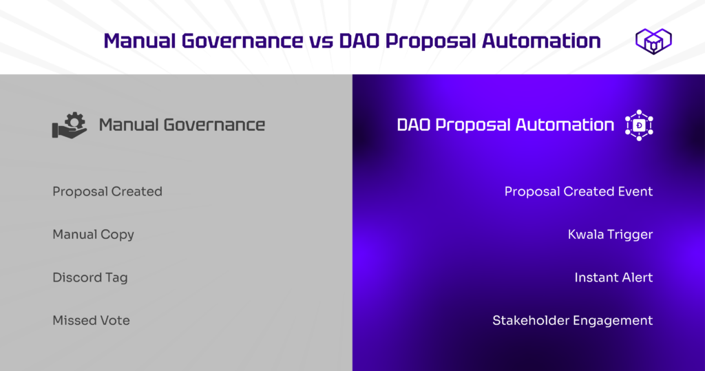 Kwala makes this possible through event-driven automation that connects on-chain governance events directly to the tools your team already uses.