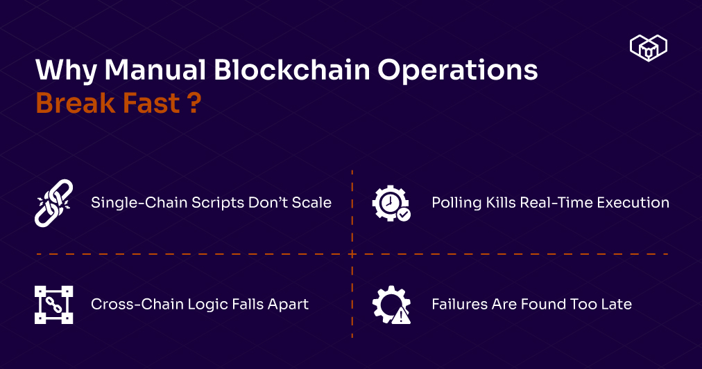 A manual blockchain workflow might look simple on paper: watch wallets, poll smart contracts, copy transaction data, and trigger scripts by hand.