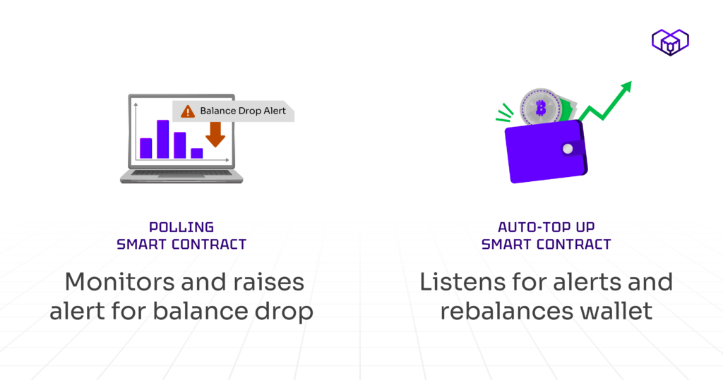 The second one is an Auto Top-Up Smart Contract. It works like a crypto wallet rebalance tool. It listens for the balance warning and automatically transfers funds from your treasury wallet when needed.