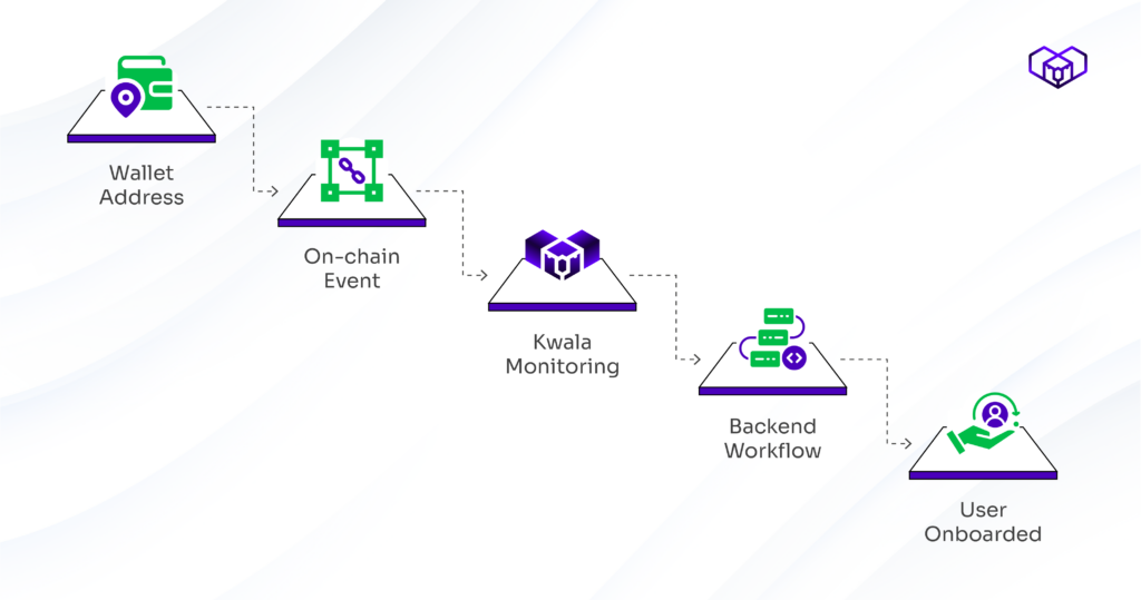 Instead of asking developers to manage servers or listeners, Kwala continuously monitors on-chain events and turns them into backend workflows. The wallet address becomes the only input needed to initiate onboarding logic.