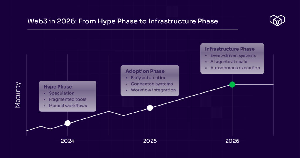 The Web3 automation roadmap for 2026 looks different from previous years. AI agents are moving from experimental to mission-critical. Event-driven architectures are becoming standard. Manual orchestration is becoming a competitive liability.