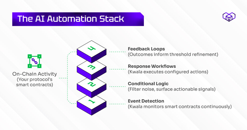 This is precisely the infrastructure layer Kwala is built to provide. Rather than requiring teams to build custom indexing, webhook servers, or event parsers, Kwala operationalizes this stack through declarative workflow configuration — you define the logic, the platform handles the execution. Kwala fits into this stack as the event-driven layer that connects on-chain activity to your automation responses. You define what to watch for. You configure what happens when conditions are met. The platform handles monitoring and execution.