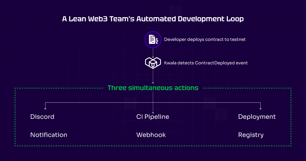 Event-driven workflows extend your pipeline into the on-chain world. When your contract emits a specific event, trigger a webhook that updates your deployment dashboard. When a testnet transaction fails, alert the developer who initiated it.