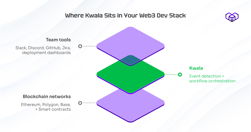 Kwala fits into this stack as the event-driven automation layer. You define triggers based on smart contract events. You configure actions that call your existing tools, whether that is Slack webhooks, Discord bots, or custom API endpoints.