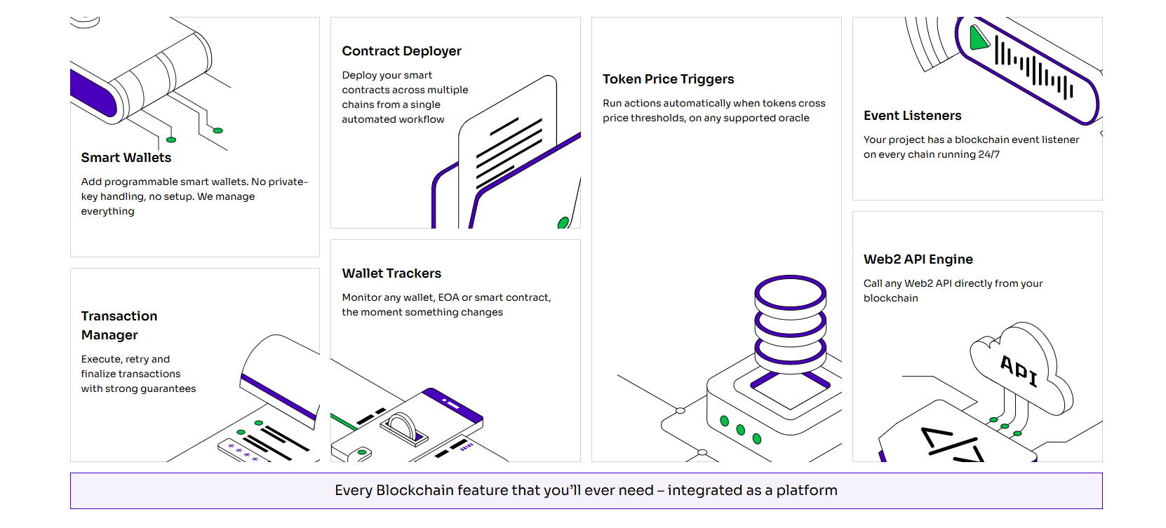 Teams end up running event listeners that break during reorgs and maintaining cron jobs for retries and time-based logic. On top of that, they stitch together custom services to coordinate smart contracts, APIs, and users.