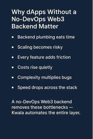 Without DevOps, teams struggle to keep servers, listeners, and backend workflows stable. A full-stack Web3 backend platform like Kwala removes this gap by automating the backend layer so dApps run reliably without manual ops work.