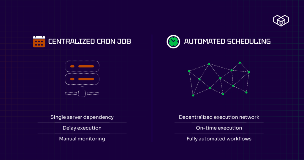 This created compounding operational risk. If your server went down during a critical governance close, the proposal stayed open past its deadline. If gas prices spiked during your scheduled treasury distribution, the transaction failed or executed at unexpected cost. If the engineer responsible changed jobs, the institutional knowledge of which cron job ran when walked out the door with them. Every time-based process became a single point of failure wrapped in decentralized clothing.