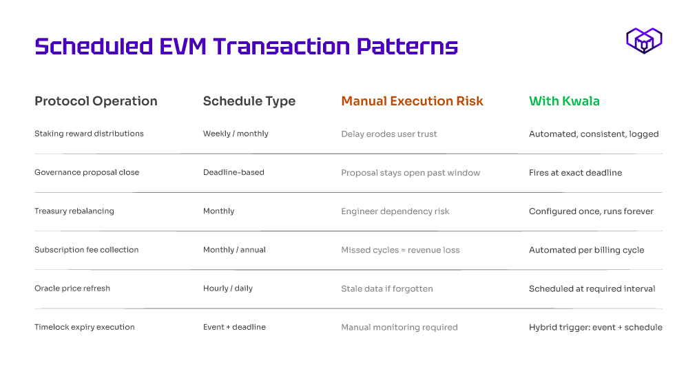 For EVM protocols, the highest-value scheduling candidates are typically identifiable by asking one question about each recurring operation: if the engineer responsible for initiating this left the company tomorrow, how long before something broke? Any operation where the answer is “within one cycle” is an immediate automation candidate.