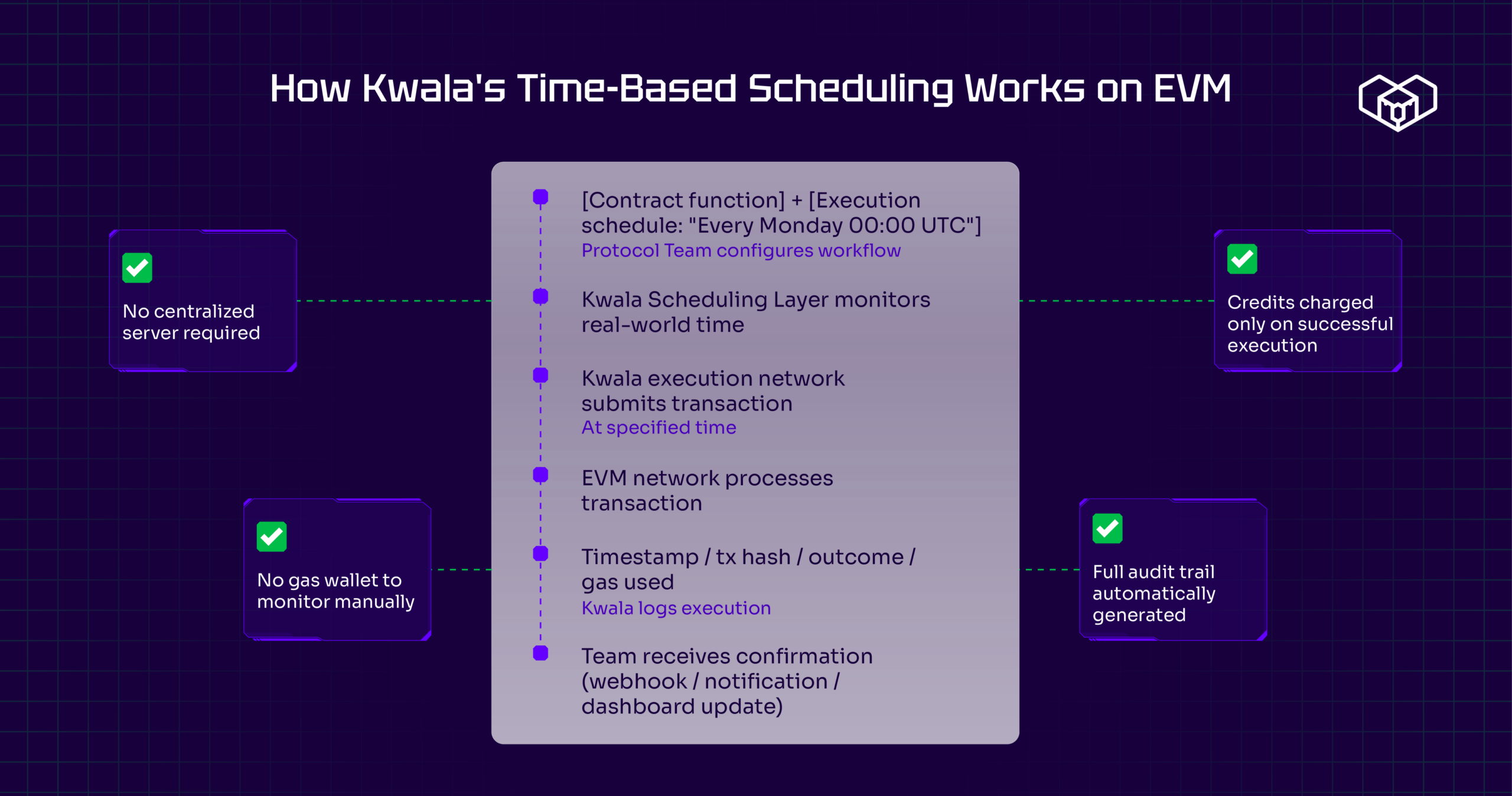 Decentralized execution removes the single point of failure that a centralized server introduces. Kwala’s execution network operates across distributed nodes rather than a single infrastructure provider, meaning no individual server going offline prevents your scheduled transaction from executing.